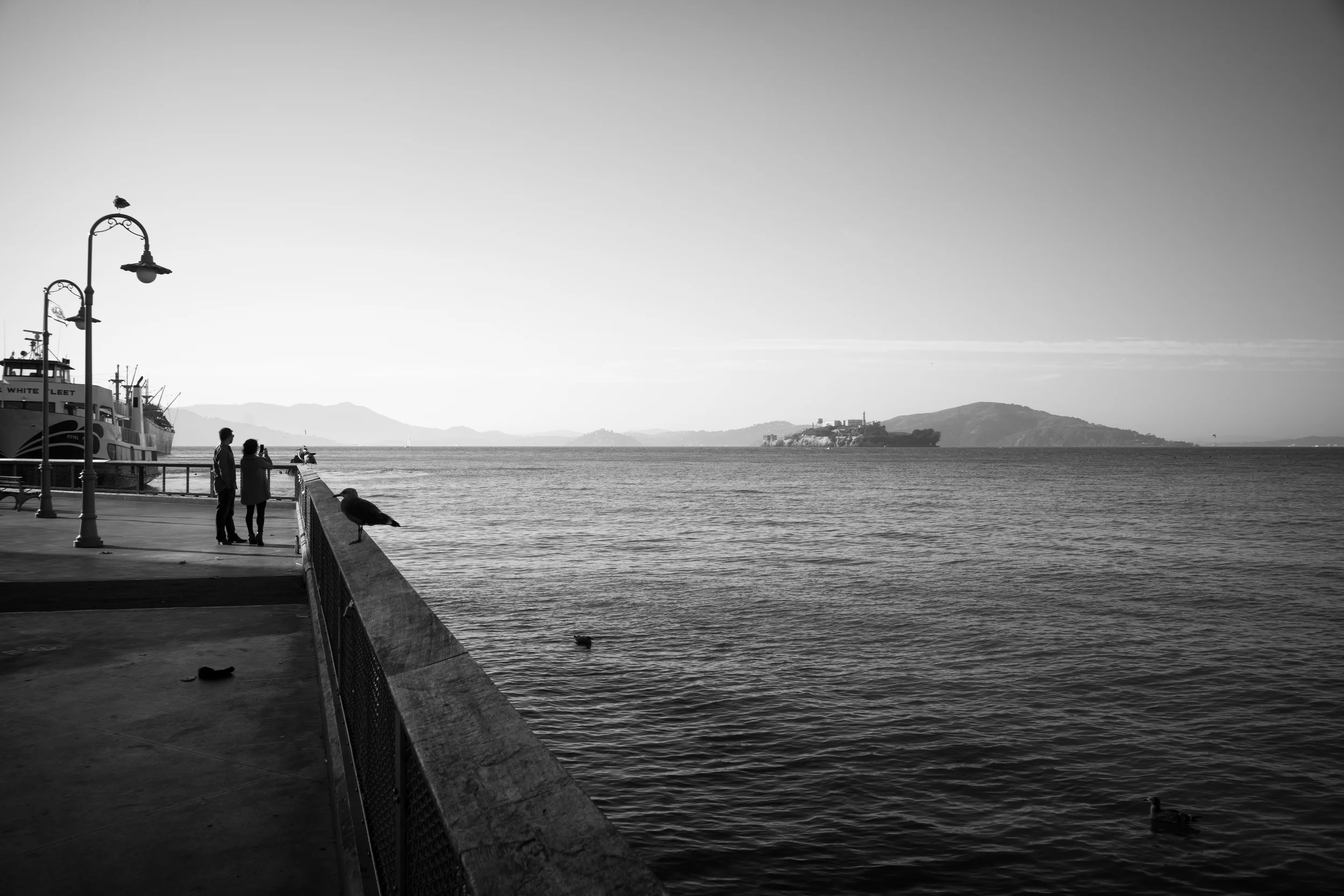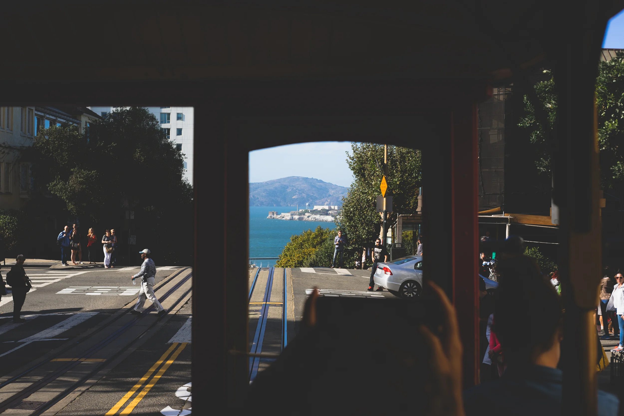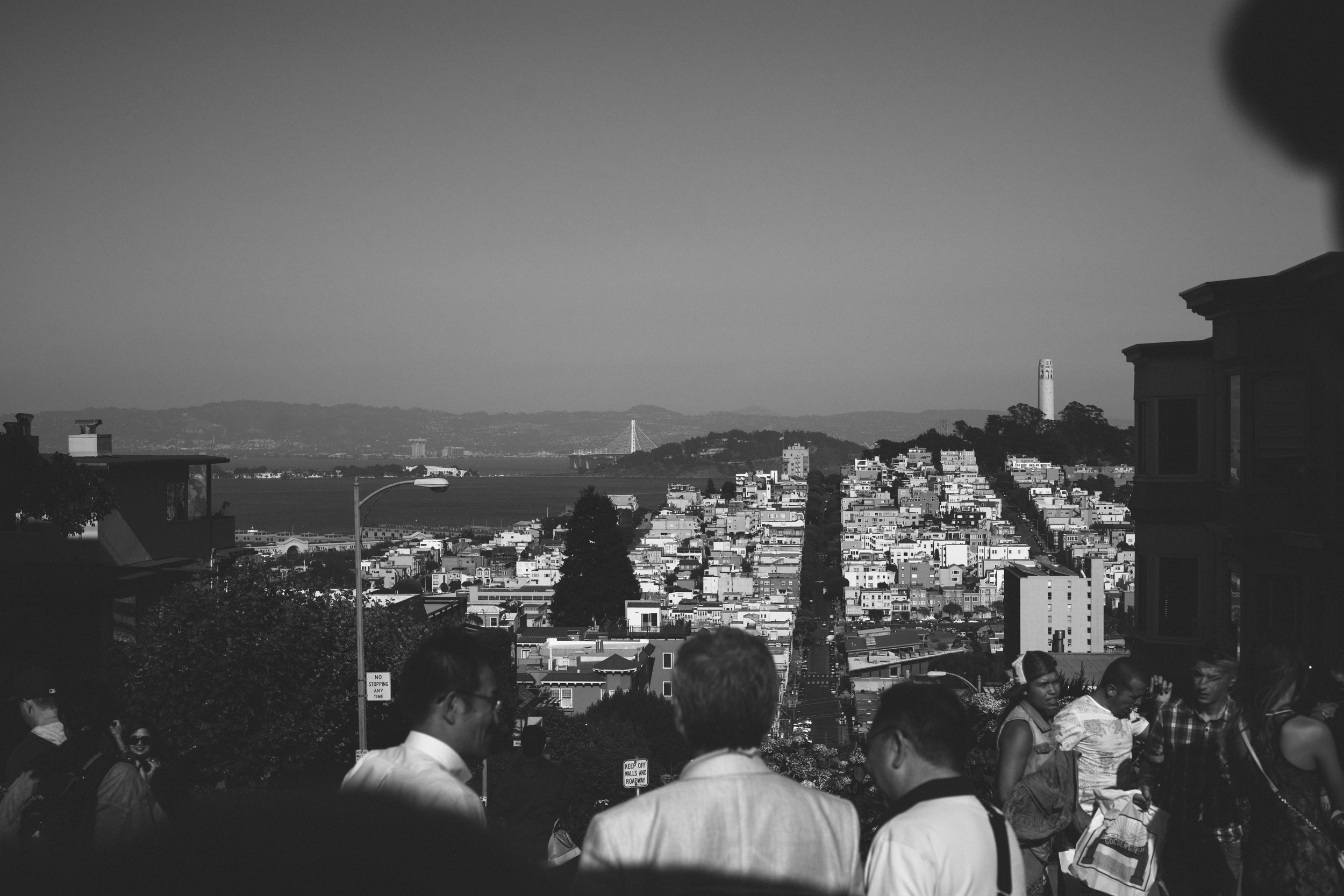 Atop Lombard street, still for a brief moment, we catch a glimpse of that most iconic Alcatraz Island.